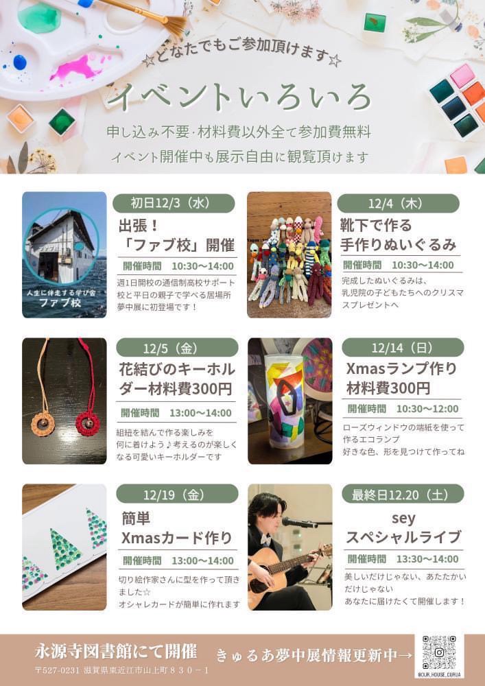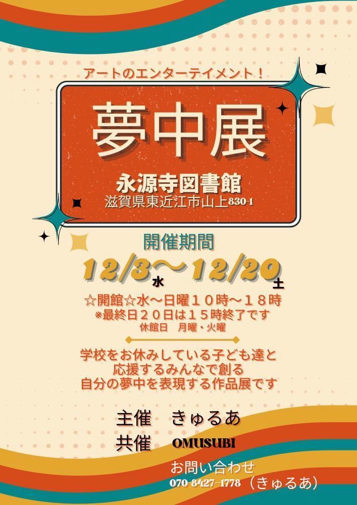 夢中展に出展 2025年12月4日 sanami_riplle お知らせ 作品展 「きゅるあ」さん主催で夢中展が東近江市永源寺図書館にて12月3日から12月20日まで開催されています。SANAMIの作品も展示しています。どうぞご覧くださいませ。